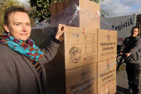 Die von Familie Bäumer in Kisten verpackten bunten Schuhkartons werden nun in eine zentrale Sammelstelle nach Berlin – Spandau gebracht. Von da aus treten sie dann mit großen LKWs die Reise nach Osteuropa, Zentralasien und sogar in die Mongolei an.