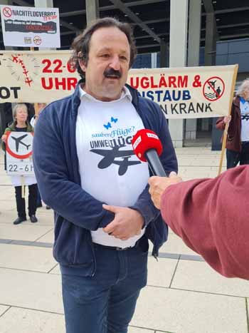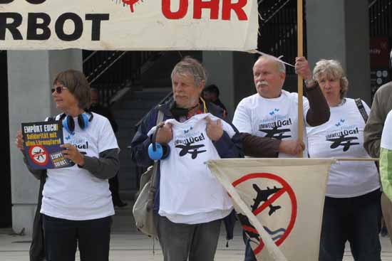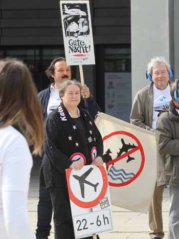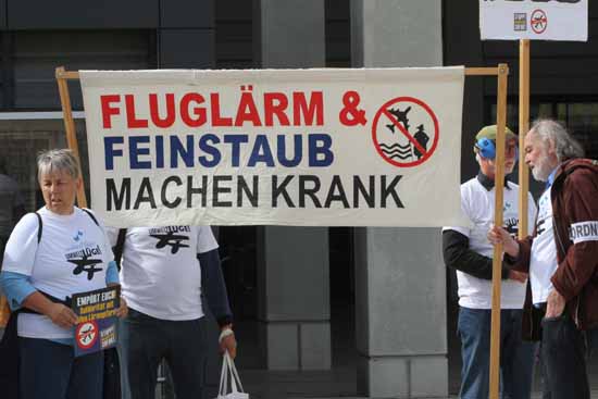 Auf Transparenten waren Botschaften wie „Fluglärm & Feinstaub machen krank“, „Empört Euch!“ und „Solidarität mit allen Lärmopfern“ zu lesen.