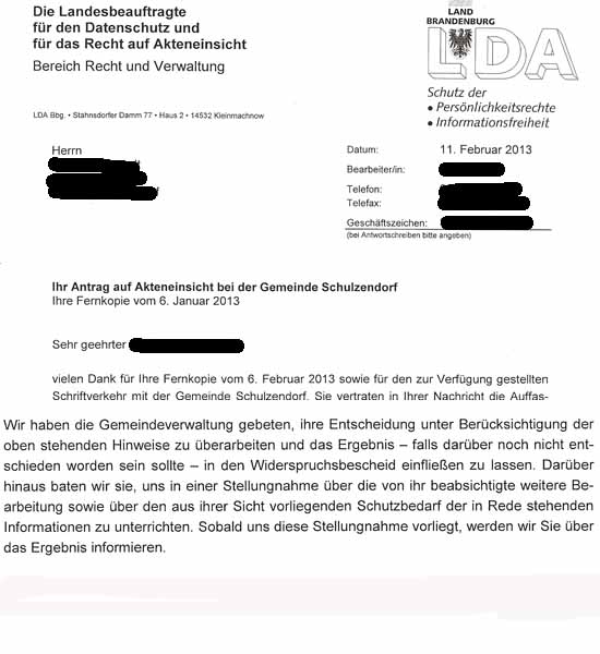 Übrigens ist der Datenschutzbeauftragte im Land Brandburg auch Beauftragter für Akteneinsicht. Fachgebiete, die hier so nichts miteinander zu tun haben!