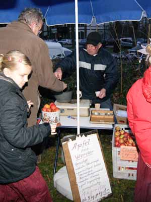 Nach dem Motto „Immer der Nase nach” lockte der Kulturklub seine Besucher an. Denn schon von weitem konnte man den süßen Duft von frisch gebackenen Waffeln wahrnehmen. Am Stand der Gartenfreunde und Eigenheimbesitzer gab es selbstgebackenen Kuchen a la Couleur: Bienenstich, Mandel- und Pflaumenkuchen, Sandkuchen, eigentlich alles was sich ein Kuchenliebhaber vorstellen kann. Joachim Kolberg begeisterte die Weihnachtsmarktbesucher mit knackigen Würsten vom Grill und einer Tombola, bei der jedes Los gewann. Der Erlös kommt den Kindern der Schulzendorfer Grundschule zu Gute. Die Seniorenhandarbeitsgruppe lockte mit Weihnachtssternen, Adventsfiguren und von den Hortkindern konnte man weihnachtliche Serviettenhalter erstehen. Knallrote Äpfel dürfen auf einem Weihnachtsmarkt natürlich nicht fehlen. Die gab es dann auch am Stand von Klaus Burmeister. Auch einen echten Weihnachtsmann, der Geschenke an Groß und Klein verteilte gab es zu bestaunen. Unter seinem dickleibigen Gewand verbarg sich Schulzendorfs künftiger Bürgermeister Markus Mücke. Ob der allerdings künftig die Wunschzettel aller Schulzendorfer erfüllen kann bleibt abzuwarten.