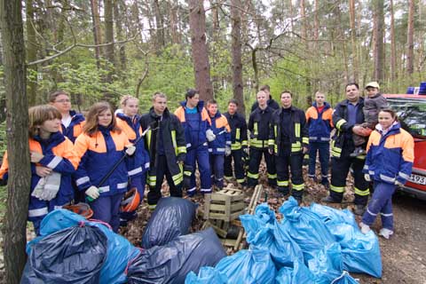 Am Mühlenschlag spannten sich Gabi Muringer und Giesela Linke vor den Karren der zwanzigköpfigen Reinigungskolonne. Die Angehörigen der Jugendfeuerwehr durchkämmten den Wald in der Kölner Straße. Sie sammelten über ein Dutzend Säcke voller Unrat. „Mit dieser Aktion leisten wir einen Beitrag für eine saubere Umwelt.”, begründete die junge Feuerwehrfrau, Jessica Wolter ihr Engagement. Am Helgolandplatz und im Wald am Ortszentrum sammelten ebenfalls viele fleißige Helfer herrenlosen Müll ein, um gerade hier das Ortsbild zu verbessern.