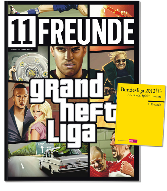 Nachdem bereits in den letzten beiden Bundesligaspielzeiten die schillerndsten Protagonisten der Liga in berühmte Cover- und Plakatmotive gesetzt wurden, präsentiert sich das Magazin als leichtfüssige Adaption eines Videospielklassikers. Das Cover der 11FREUNDE „Grand Heft Liga“ zieren Jérôme Boateng mit Gina-Lisa Lohfink, Ribéry und Robben im Nahkampf und Jürgen Klopp auf der Überholspur. Meistertrainer Jürgen Klopp darf dann auch in einem ausführlichen Gespräch vom Umgang mit Misserfolg, schlaflosen Nächten und dem Urgedanken des Fußballs berichten.