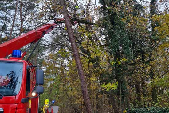 Letzten Freitag blies in den frühen Morgenstunden ein Wind der Stärke 5. Es trat das ein, was vorhersehbar war. Eine etwa 12 Meter hohe Kiefer kippte um und lag quer auf der Straße. Andere Bäume wurden entwurzelt, hielten sich gegenseitig und drohten auf die Straße zu stürzen – Lebensgefahr! Sieben Kameraden der Feuerwehr kamen mit zwei Einsatzfahrzeugen und Räumtechnik und beseitigten die Gefahren.