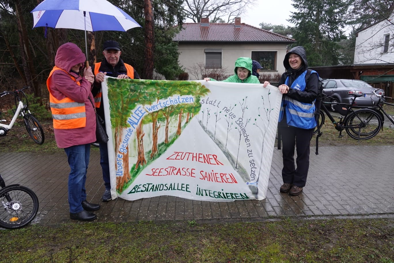 Mit ihnen haben wohl nur wenige gerechnet: Gegen 8 Uhr tauchten Naturschutz-Aktivisten vom NABU Dahmeland e.V. und Anwohner auf und protestierten gegen die Abholzung. Man sei nicht gegen die Sanierung der Holperpiste, sagte NABU-Chef Matthias Rackwitz. „Wir sind gegen die Fällung von Bäumen, ohne das zuvor gewissenhaft geprüft wurde, ob sie bei der Erneuerung der Straße erhalten werden können. Zum Beispiel durch Wurzelbrücken. Ohne Alternativen geprüft zu haben, darf die Kettensäge nicht angeworfen werden.“, so Rackwitz.