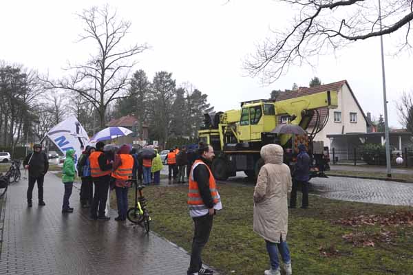 Eichwalde. Eigentlich sollte heute Morgen mit den Baumfällungen in der Zeuthener Straße begonnen werden. Ein Kranfahrzeug mit Arbeitern des ausführenden Unternehmens und Vertreter des Landesbetriebs Straßenwesen hatten sich zu einer Anlaufberatung getroffen.