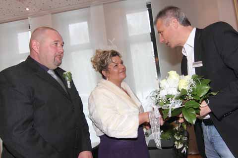 Bianca und Andreas Hiller aus Schulzendorf gaben sich vor Eichwaldes Standesbeamtin Sabine Fitz  um 13:30 Uhr das Ja – Wort. Die moderne  Kulisse mit silbernen Kerzenständern, weißen Ledersesseln und einem überdimensionalen Wandbild einer blühenden Rose sorgen für eine perfekte Hochzeitsatmosphäre. Rund 20.000 Euro investierte die Gemeinde Schulzendorf in die festlichen vier  Wände.   „Das Ambiente im Trauzimmer ist wunderbar. Es hat uns sehr gut gefallen.”, sagte der stolze und überglückliche Bräutigam im Anschluss an sein Eheversprechen.