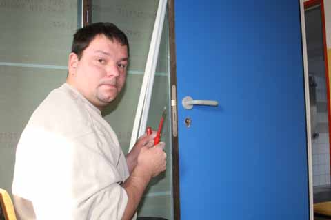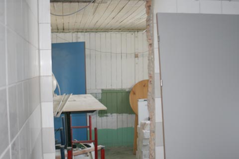 „Seit meiner Jugend bin ich bei der SG Schulzendorf. Ich fühle mich mit ihr sehr eng verbunden und deshalb ist es für mich eine Ehrensache hier Hand anzulegen.”, bekannte sich Enrico Brandt, der gerade mit dem Austausch von Schlössern an den Innentüren beschäftigt war. Und wenn es einmal brannte waren die Mitstreiter um Michael Merckel zur Stelle. Erst jüngst war ein solcher „Feuerwehreinsatz” erforderlich. Der Fliesenleger inspizierte die zu bearbeitenden Untergründe und hielt es für notwendig, den Estrich zu erneuern. Zu gefährlich, wegen der vielen Risse und Schadstellen, wäre es, auf dem vorhandenen Untergrund zu fliesen. Schon am nächsten Morgen waren Frank Kober und Jörg Pianowski mit Stemmhammer, Schubkarre und Schaufel zur Stelle und brachen den schadhaften Estrich ab. Am Abend war das Werk vollbracht und für den Estrichleger gab es grünes Licht!