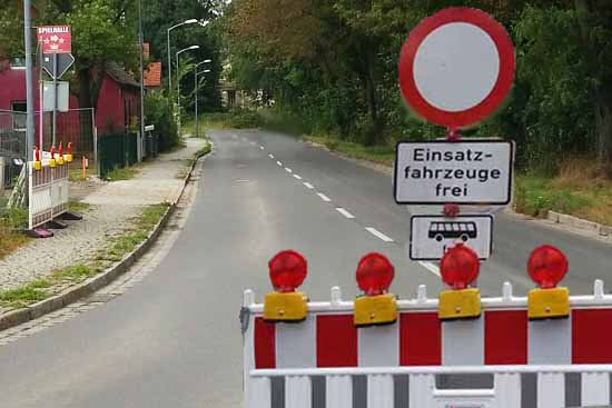 Kraftfahrern wird die Umleitung über Miersdorfer Straße/Dahlewitzer Chaussee (L 402) oder über den Apfelweg empfohlen.