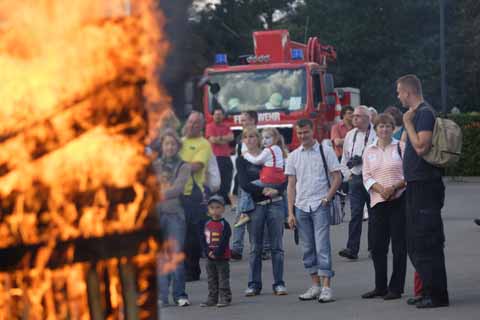Später brannte es dann tatsächlich auf dem Gelände, allerdings kontrolliert. Während einer simulierten Feuerlöschübung bewies die Schulzendorfer Feuerwehr ihr Können.