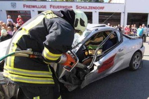 Hautnah verfolgten die Gäste wie ein PKW – Fahrer mit schwerer Technik aus seinem verunfallten Wagen geborgen wurde. “5/24 – 1 Absitzen!” – kommandierte Löschgruppenführer Alexander Roosch seine Kameraden. Die sprangen vom Rettungsfahrzeug und rollten Kabel und Druckschläuche aus, brachten Feuerlöscher in die richtig Position, warfen den Dieselgenerator an und binnen weniger Sekunden arbeitete sich die schwere Schneidetechnik in das Autowrack vor. Jeder Handgriff saß und innerhalb kurzer Zeit war der verletzte Fahrer befreit.