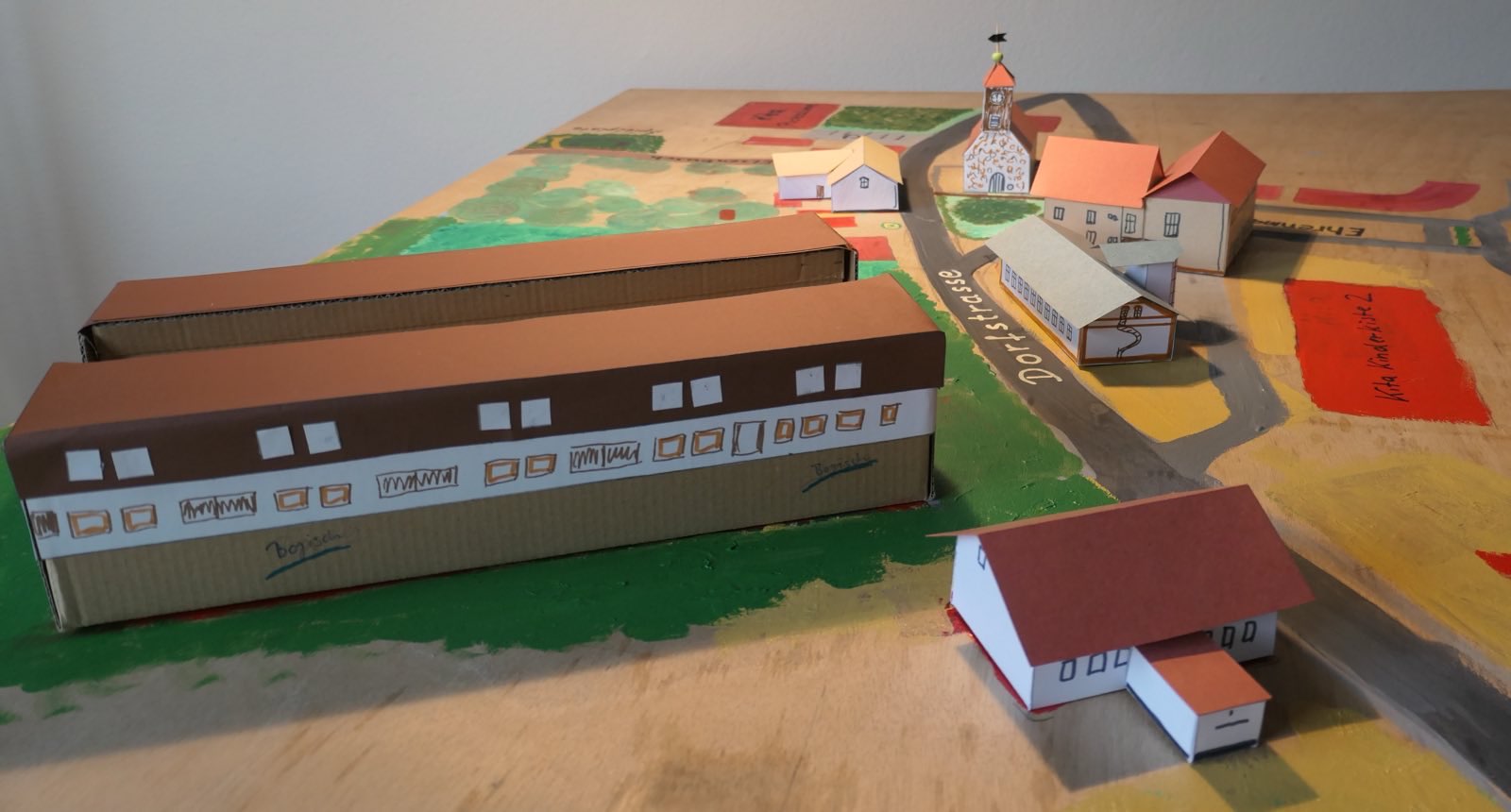 Modellbauerin Kerstin Bethke: „Ich habe nie zuvor Modelle gebaut, konnte mit der dünnen Pappe für die kleineren Häuser ganz gut umgehen, mit der dicken Pappe des ehemaligen Kartons, aus dem das Projektmodell besteht, trotz mehrmaliger Versuche leider nicht.“