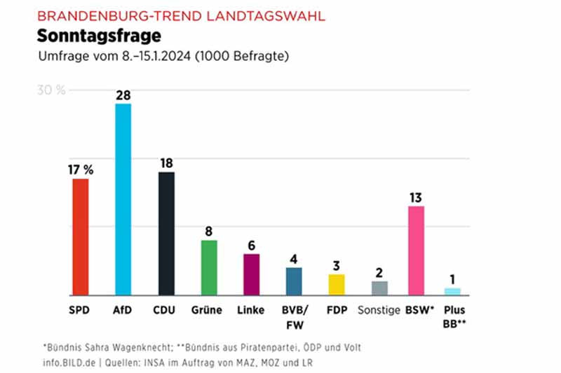 Einer Umfrage des Meinungsforschungsinstituts Insa im Auftrag der Märkischer Allgemeiner Zeitung (MAZ), Märkischer Oderzeitung (MOZ) und Lausitzer Rundschau (LR) zufolge, liegt die AfD in der Brandenburger Wählergunst unangefochten auf Platz 1. Immer stärker wird die Partei von Sahra Wagenknecht, BSW. Aus dem Stand liegt sie in der Wählergunst bei 13 Prozent.
